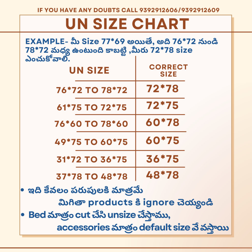 - Sofa cum bed తో వచ్చే accessories నీ కేవలం 10 రూపాయలకే ఇస్తున్నాం కాబట్టి transport లో ఏదైనా చిన్న damage వస్తే మీరు adjust అవ్వవలసి ఉంటుంది, ఒకవేళ return చేయాలి అనుకుంటే మేము కేవలం 10 రూపాయలు మాత్రమే తిరిగి ఇవ్వగలం.
